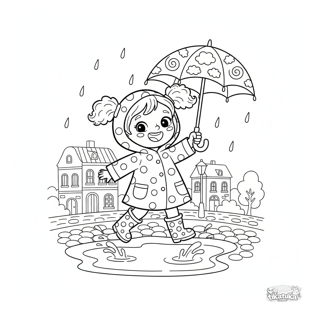 Página para colorear para niños 5-7: una niña alegre con impermeable salta en un charco con un paraguas arcoíris. Escena activa con detalles equilibrados.