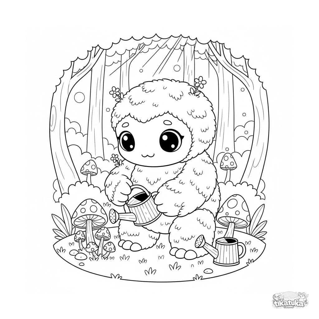 Página para colorear para niños 4-6: un amigable golem de musgo cuidando hongos brillantes en un bosque encantado. Escena de fantasía pacífica.