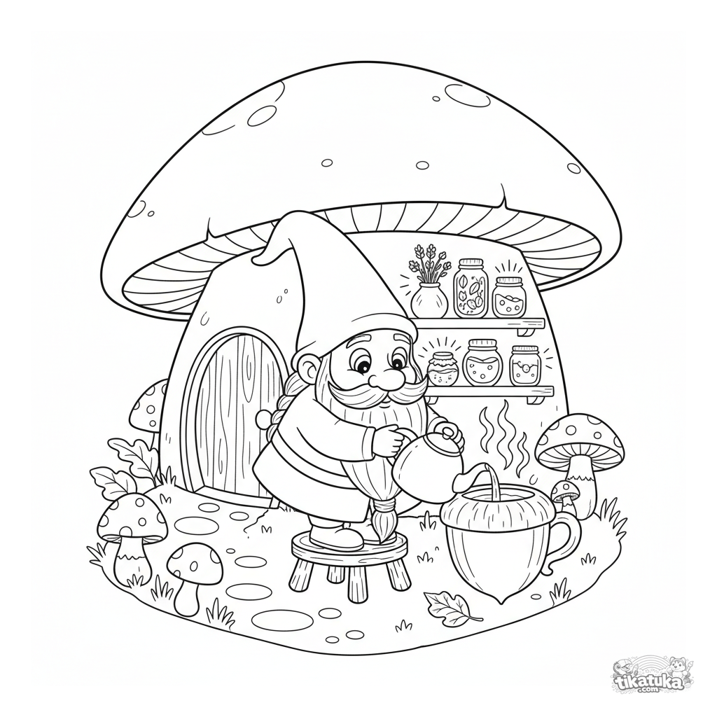 Página para colorear para niños 4-6: un gnomo preparando té en una acogedora casa de champiñones. Escena de fantasía con detalles.