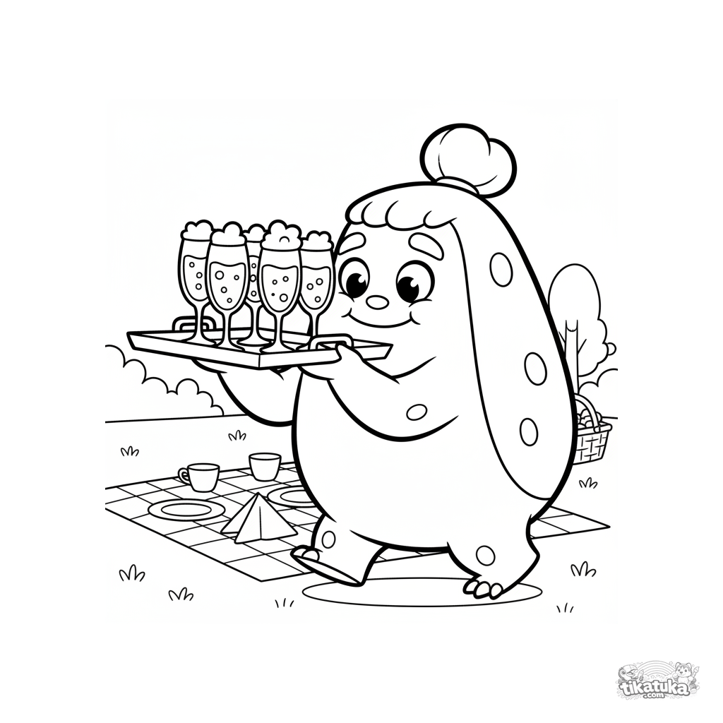 Página para colorear para 7-9 años: un monstruo ancho al estilo Disney lleva una bandeja de bebidas burbujeantes al picnic. Escena expresiva.