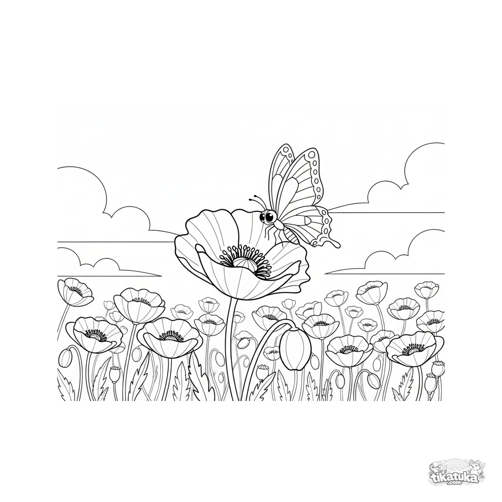 Página para colorear para niños de 4 a 6 años: un campo de amapolas al atardecer con una mariposa. Escena hermosa y simple.