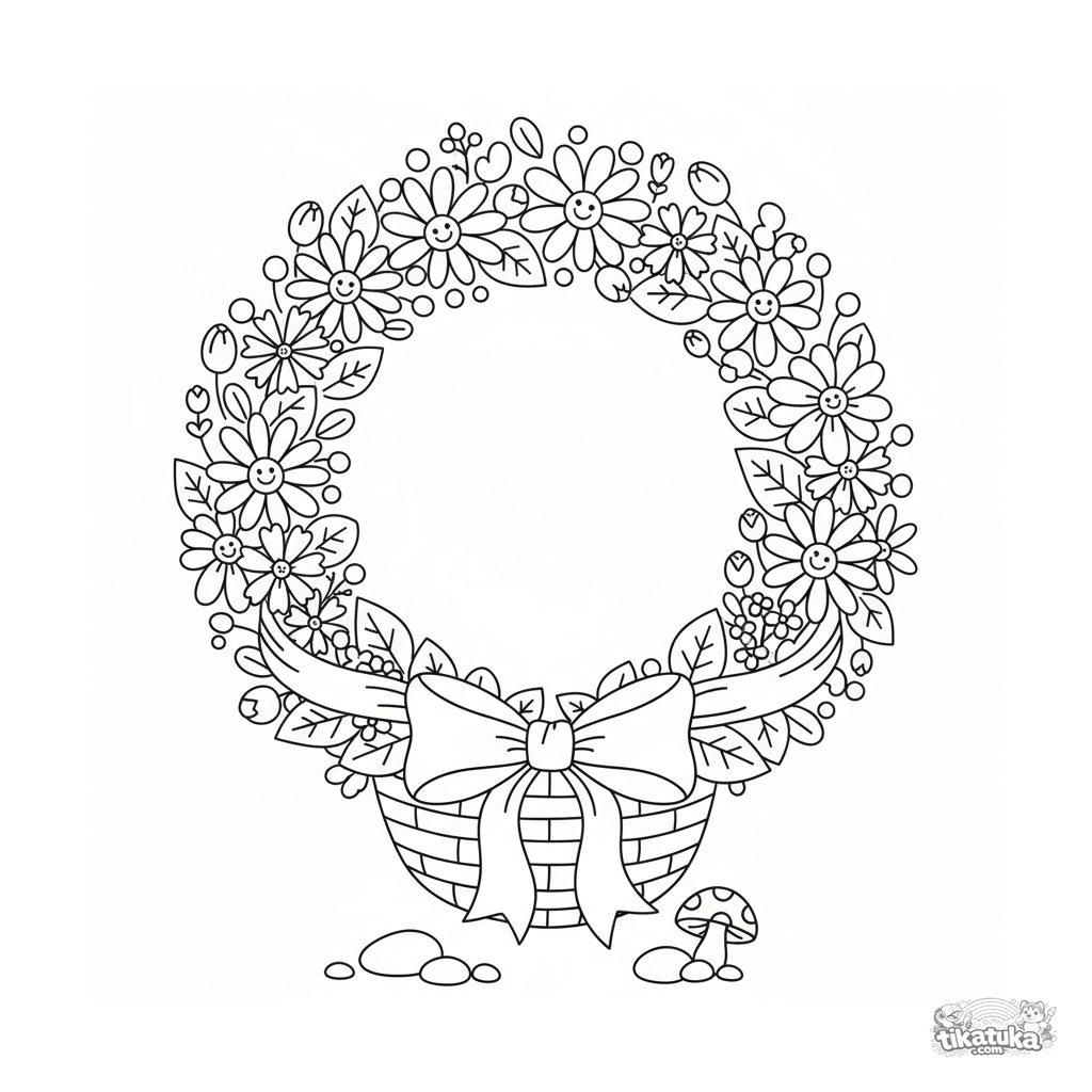 Página para colorear para niños 4-6: una corona circular de flores silvestres con un lazo de cinta. Estilo folclórico, ánimo alegre.