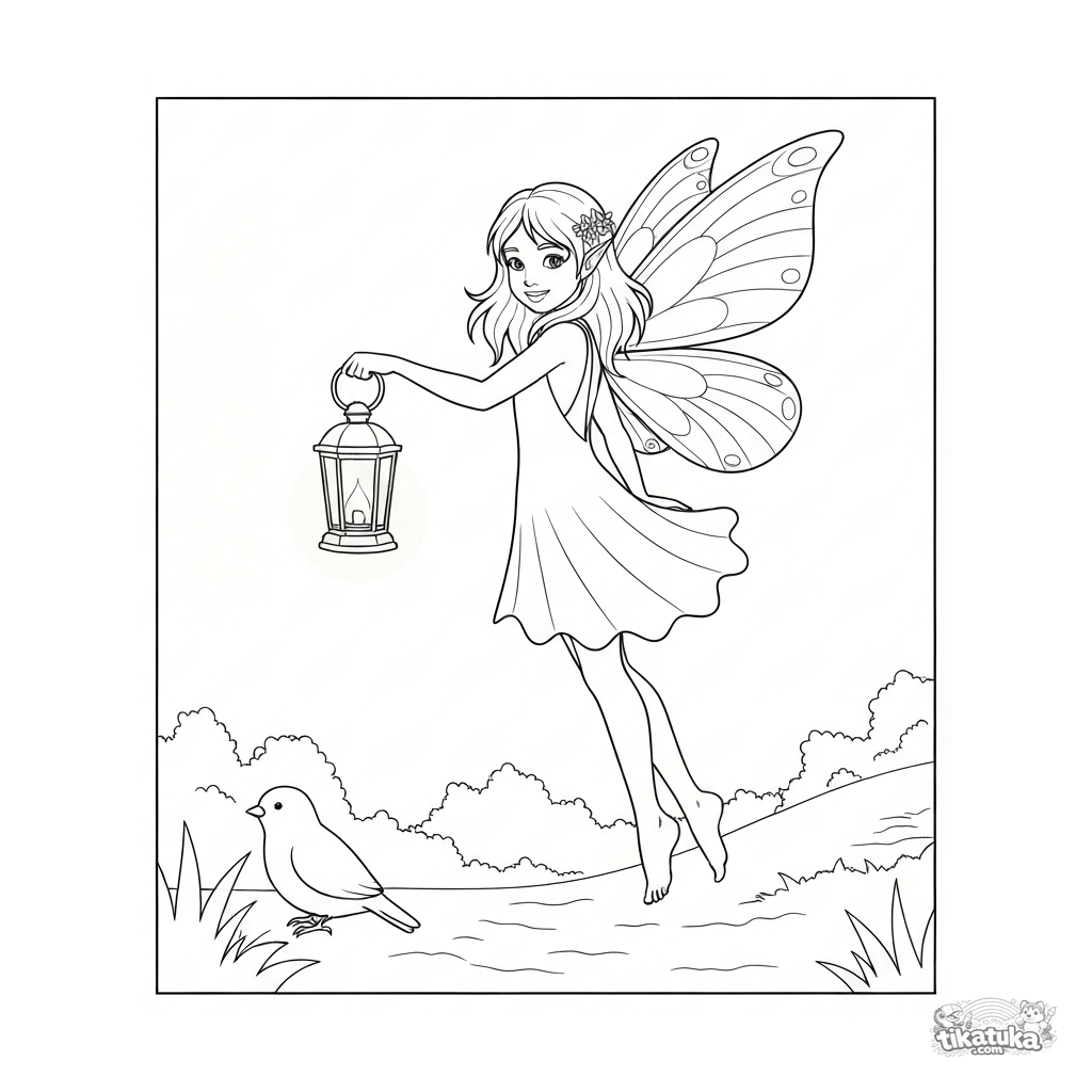Página para colorear para niñas: un delicado hada fuego fatuo brilla con una linterna para iluminar el camino. Dibujo realista simple con tema mágico.