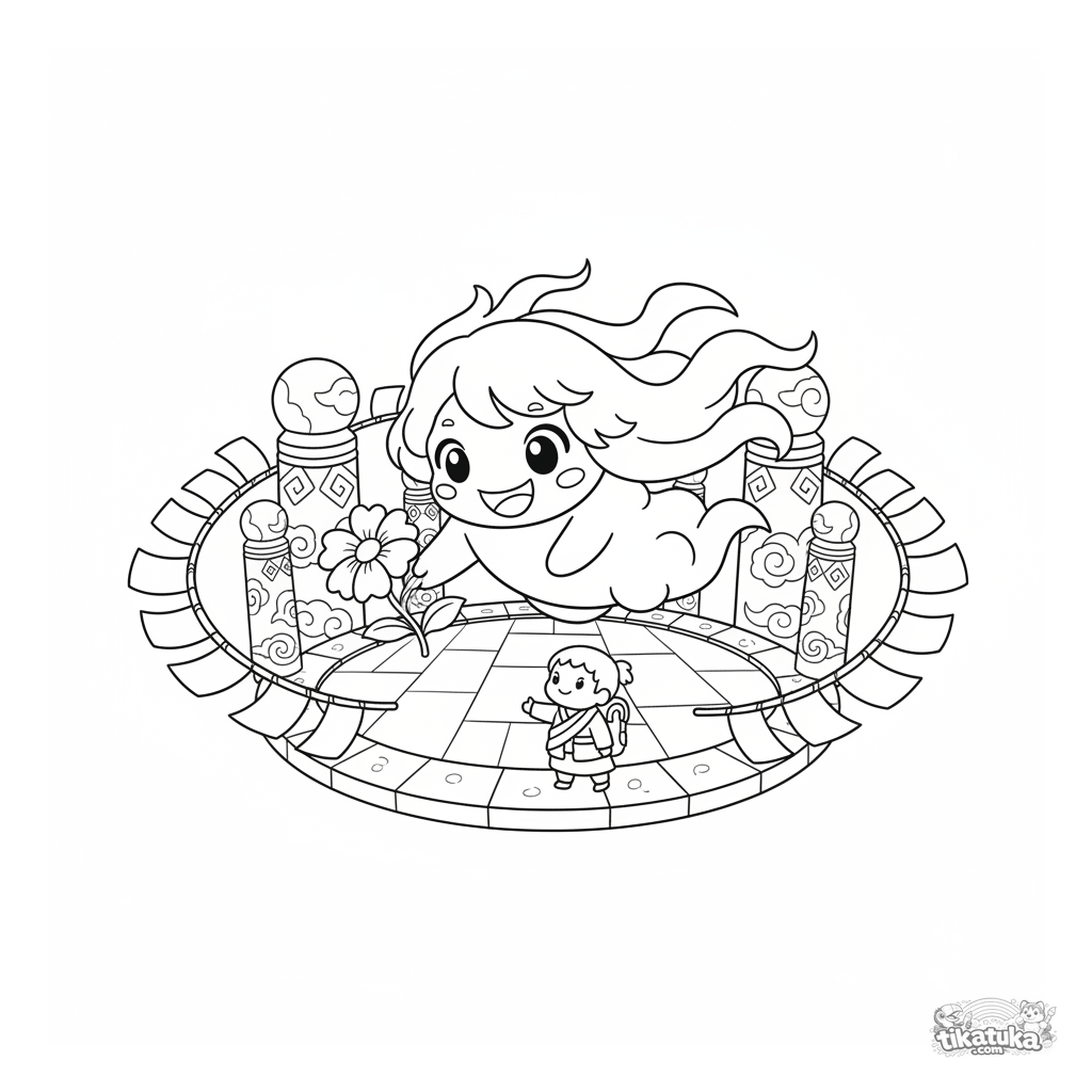 Página para colorear para niños de 5-9 años: un espíritu del viento alegre ayuda a un viajero en un templo de montaña antiguo. Líneas dinámicas y escena positiva.