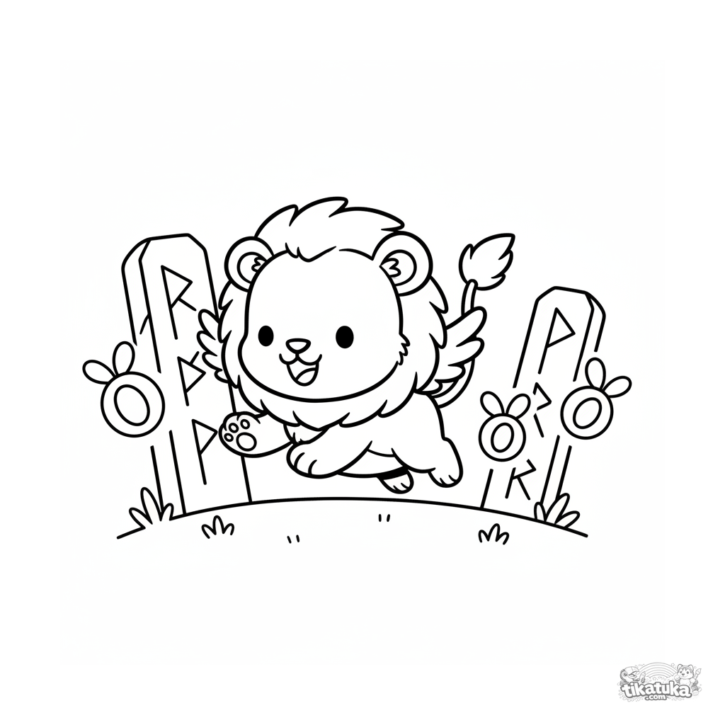 Página para colorear para niños pequeños: un esponjoso cachorro de león alado salta feliz tras las luciérnagas entre antiguas piedras rúnicas al anochecer. Formas muy simples y grandes con amplios márgenes.