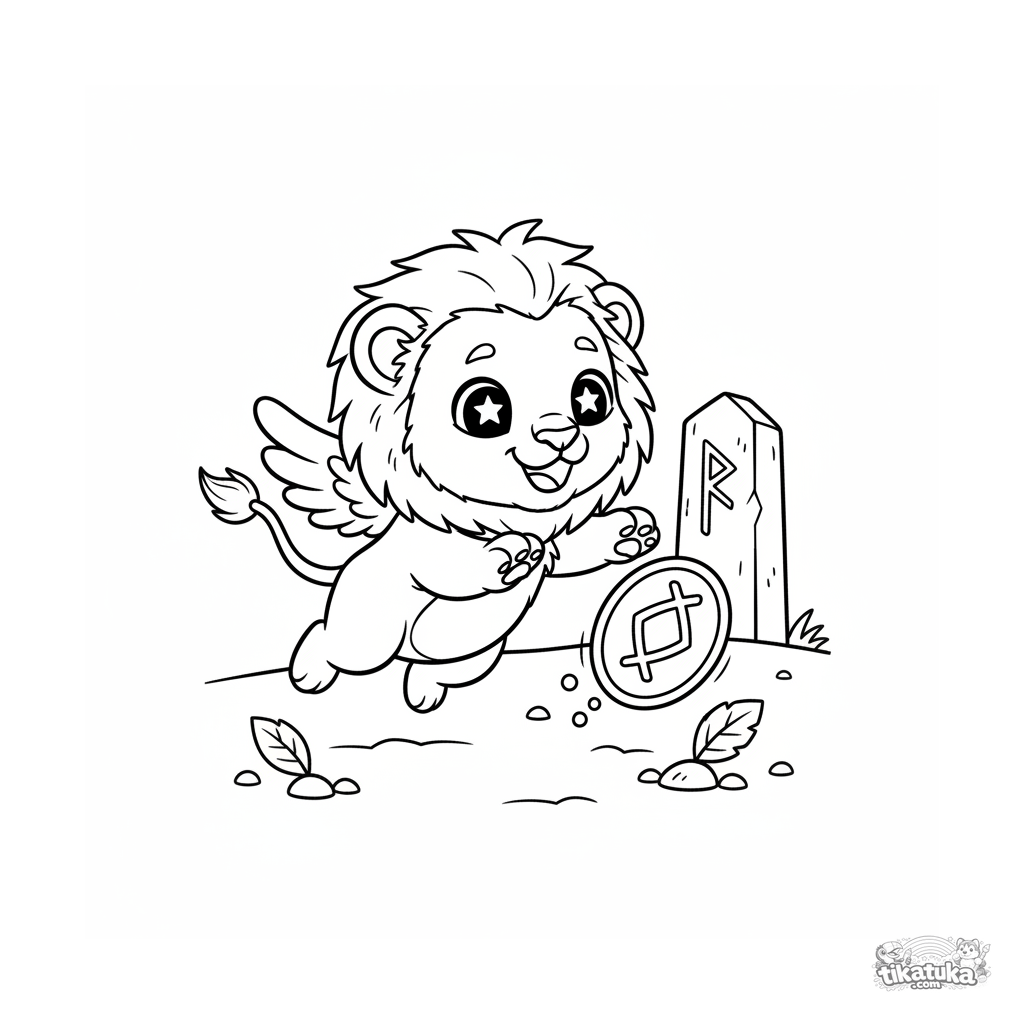 Página para colorear para preadolescentes 7-9: un esponjoso cachorro de león alado en pleno salto intenta atrapar una runa mágica brillante que flota libre de un antiguo monolito. Escena dinámica y mágica.