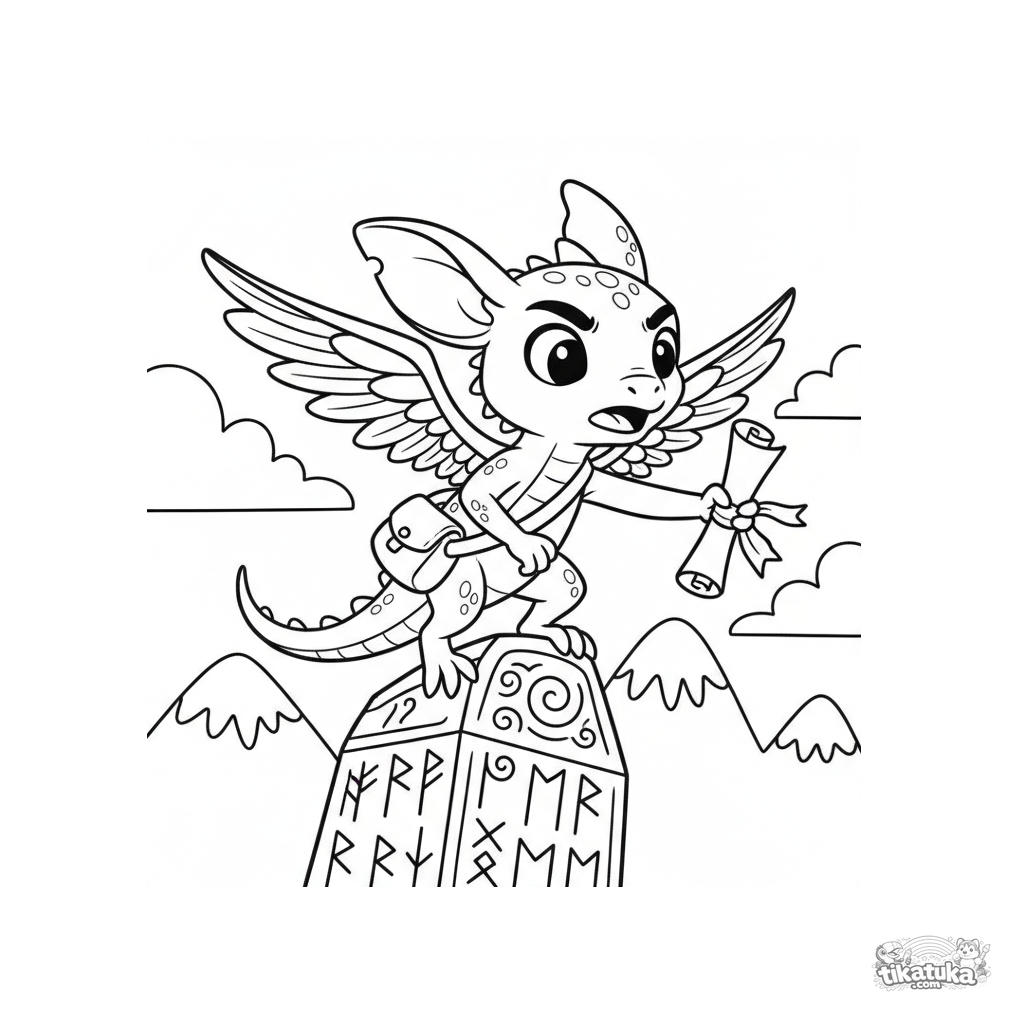 Página para colorear para preadolescentes 7-9: un lagarto alado mensajero con mirada urgente entrega un pergamino a un monolito rúnico. Pose dinámica, alforja, contornos claros.