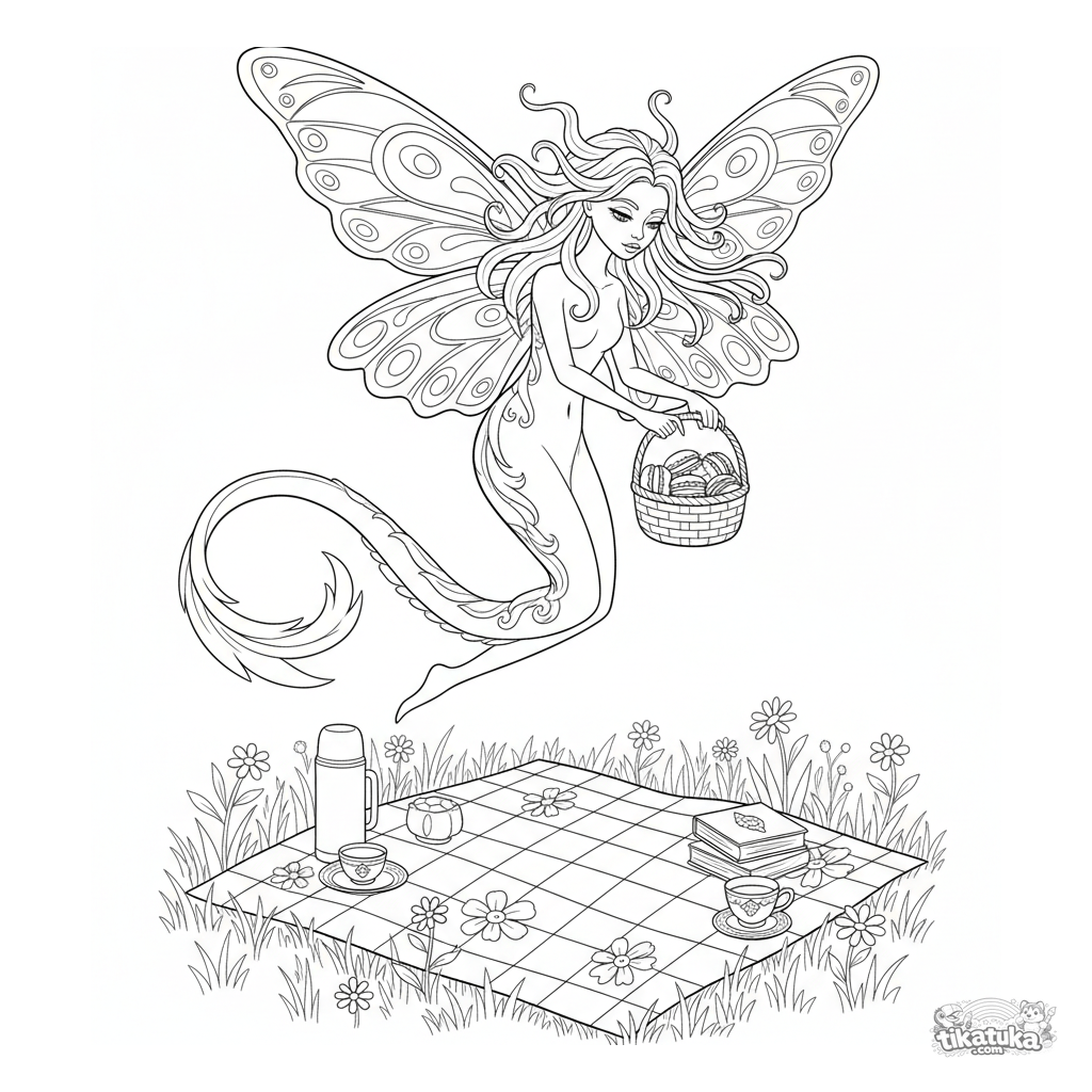 Página para colorear compleja estilo art-nouveau para niños de 10-12 años: un elegante monstruo alado entrega macarons en un picnic.
