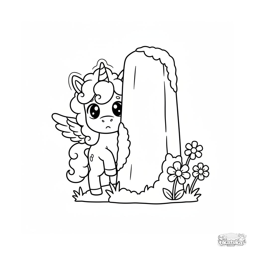 Página para colorear para niños pequeños: un adorable potro de unicornio alado asoma tímidamente desde detrás de un antiguo monolito. Contornos muy simples y grandes.