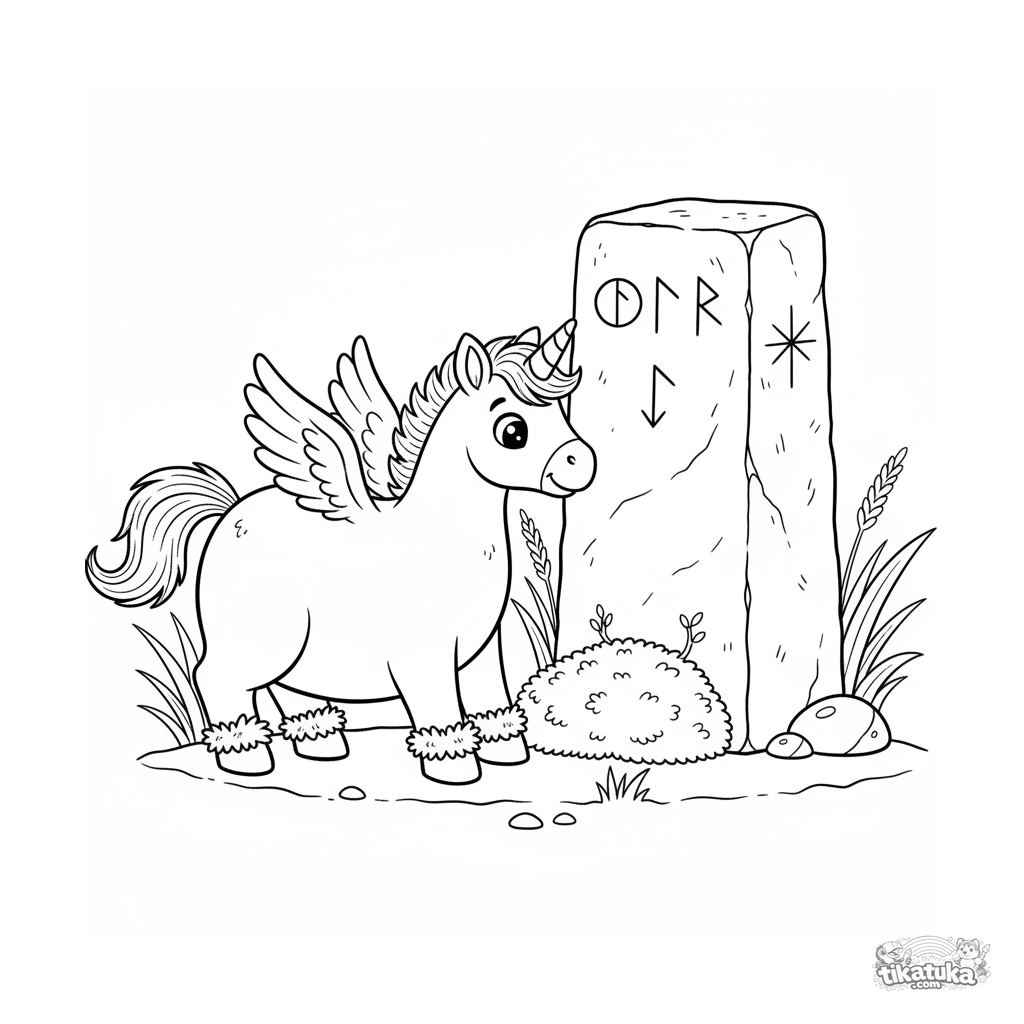 Página para colorear para niños 4-6: un adorable potro de unicornio alado explora con curiosidad el musgo al pie de un antiguo monolito con runas.