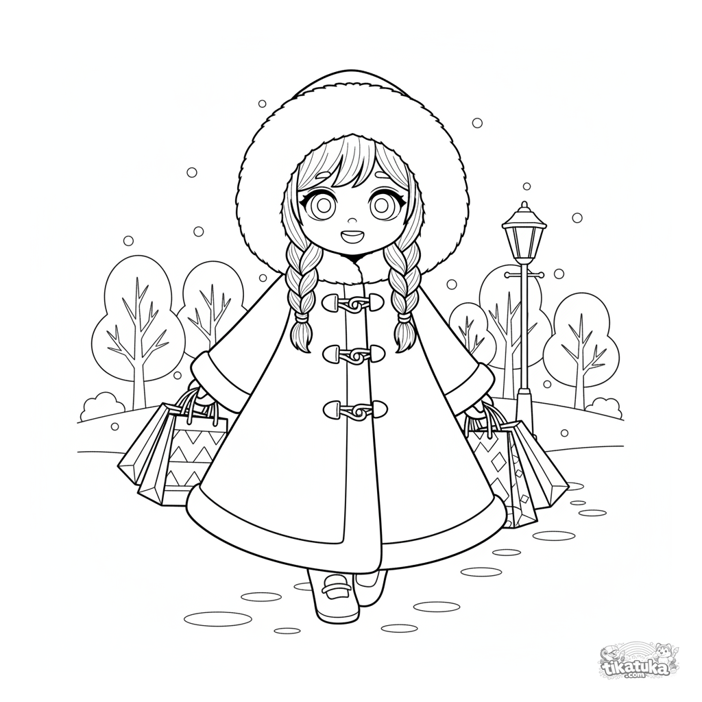 Página para colorear para niñas 10-12: outfit invernal acogedor con abrigo de pieles en un parque urbano nevado. Escena invernal detallada con farola y árboles.