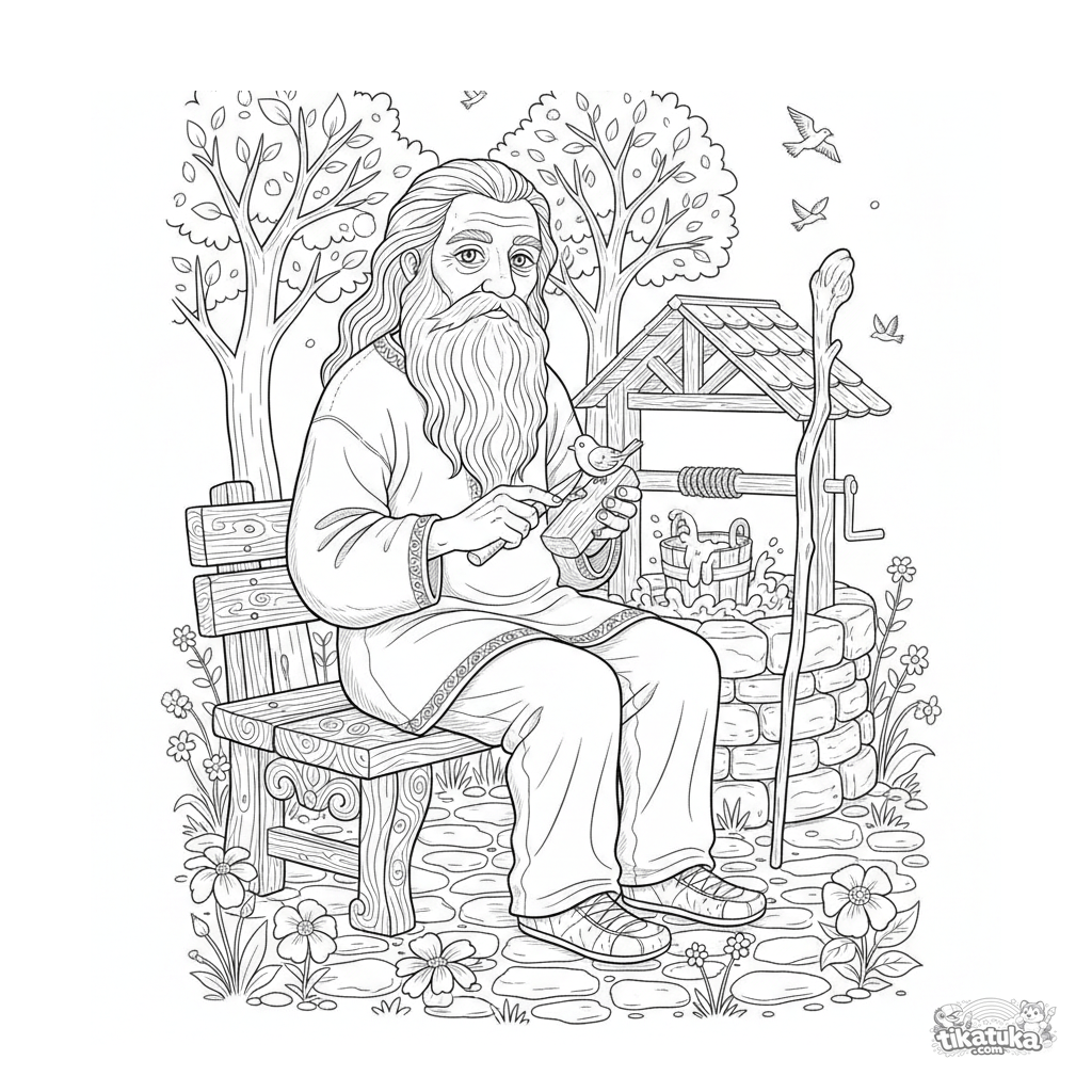Página para colorear para niños 10-12: un anciano guardián sentado junto al pozo de agua viva tallando una figura. Escena detallada en estilo grabado antiguo.