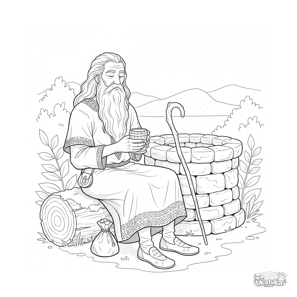 Página para colorear para niños mayores 10-12: un anciano sabio descansa junto a un antiguo pozo de agua viva. Escena detallada para colorear con tonos tranquilos.