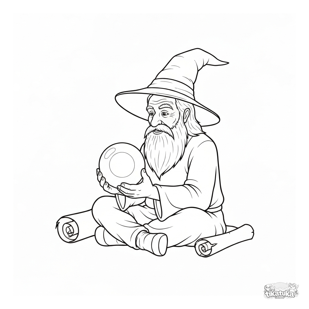 Página para colorear de un mago sabio sosteniendo una bola de cristal brillante. Escena interesante y simple para niños de 3 a 5 años.