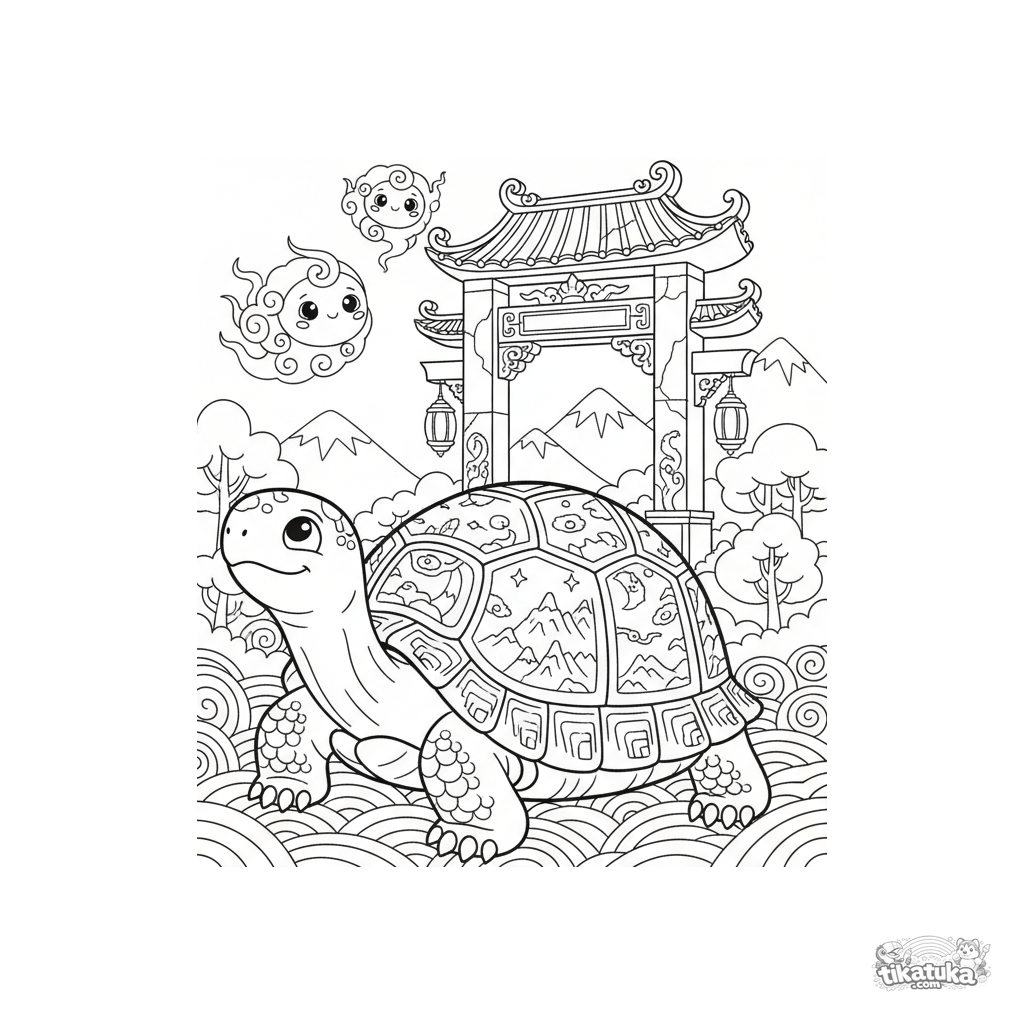 Página para colorear para niños de 5-9 años: una tortuga antigua y sabia se encuentra con espíritus divinos brillantes en la puerta de un templo de montaña. Escena estilo lubok popular.