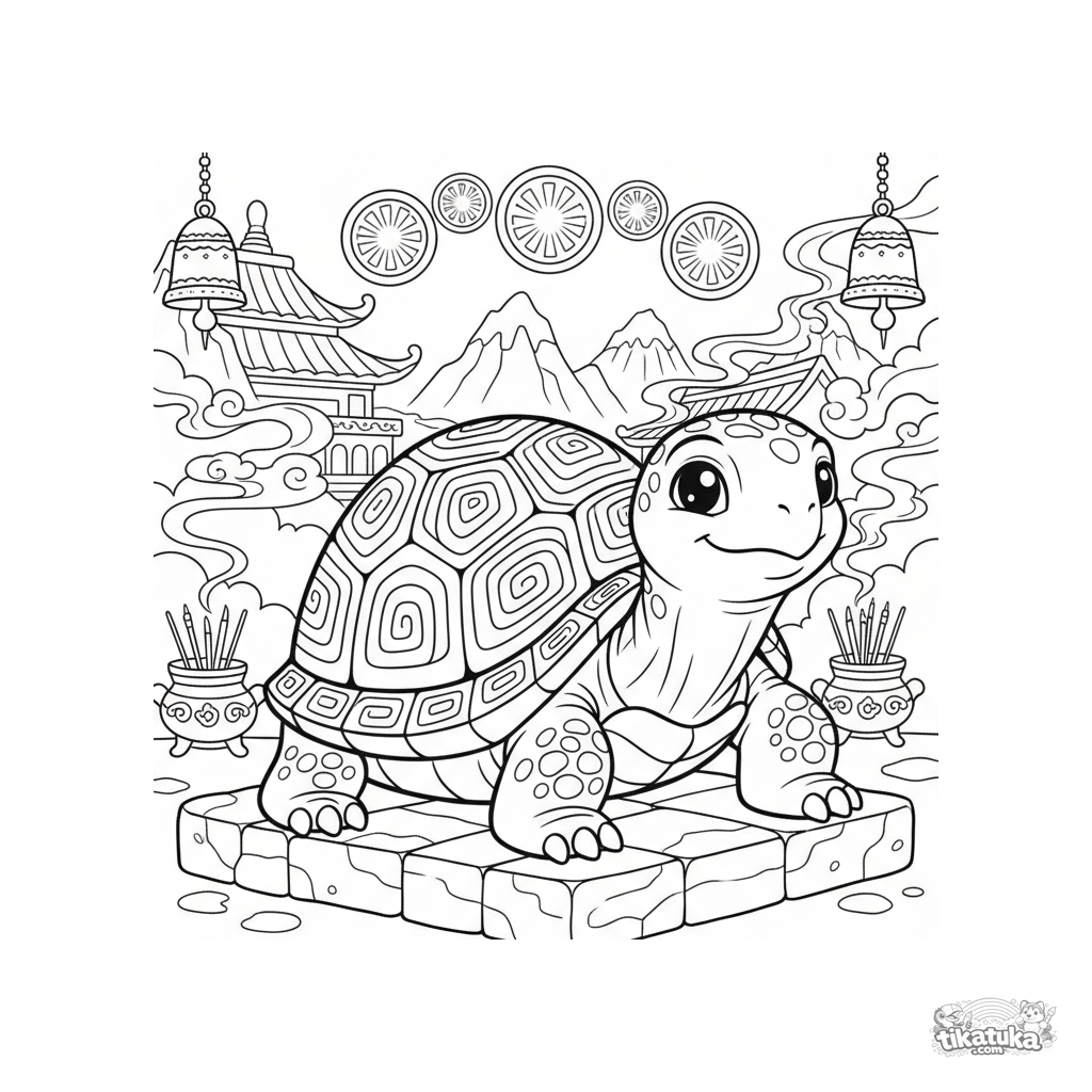 Página para colorear para niños: una tortuga sabia antigua se sienta en un templo de montaña, encontrándose con dioses representados como orbes brillantes, con quemadores de incienso y campanas alrededor.