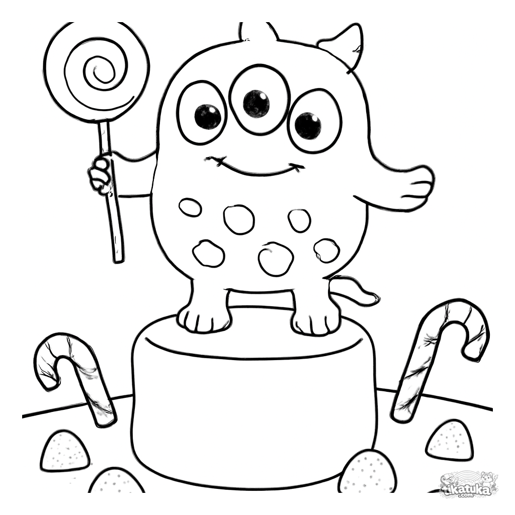 Página para colorear de un monstruo de tres ojos equilibrado en un malvavisco en un prado de dulces. Imagen fácil para niños de 2 a 5 años.