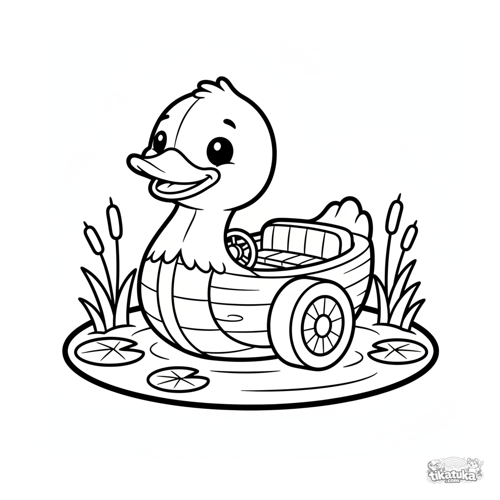 Página para colorear para niños pequeños: un bote de pato amigable en un estanque tranquilo. Formas simples y márgenes amplios.