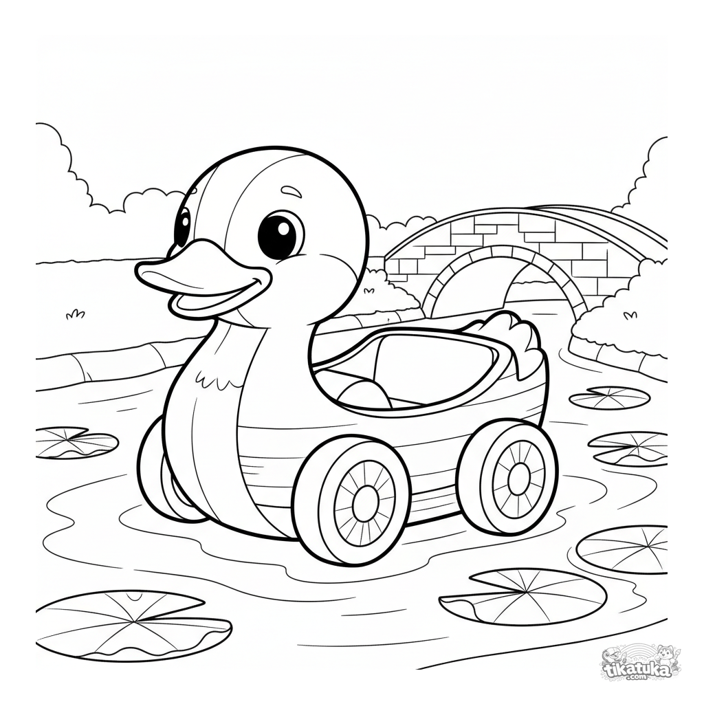 Página para colorear para niños pequeños: un alegre bote de pedales con forma de pato en un estanque tranquilo. Formas simples y amplios márgenes.