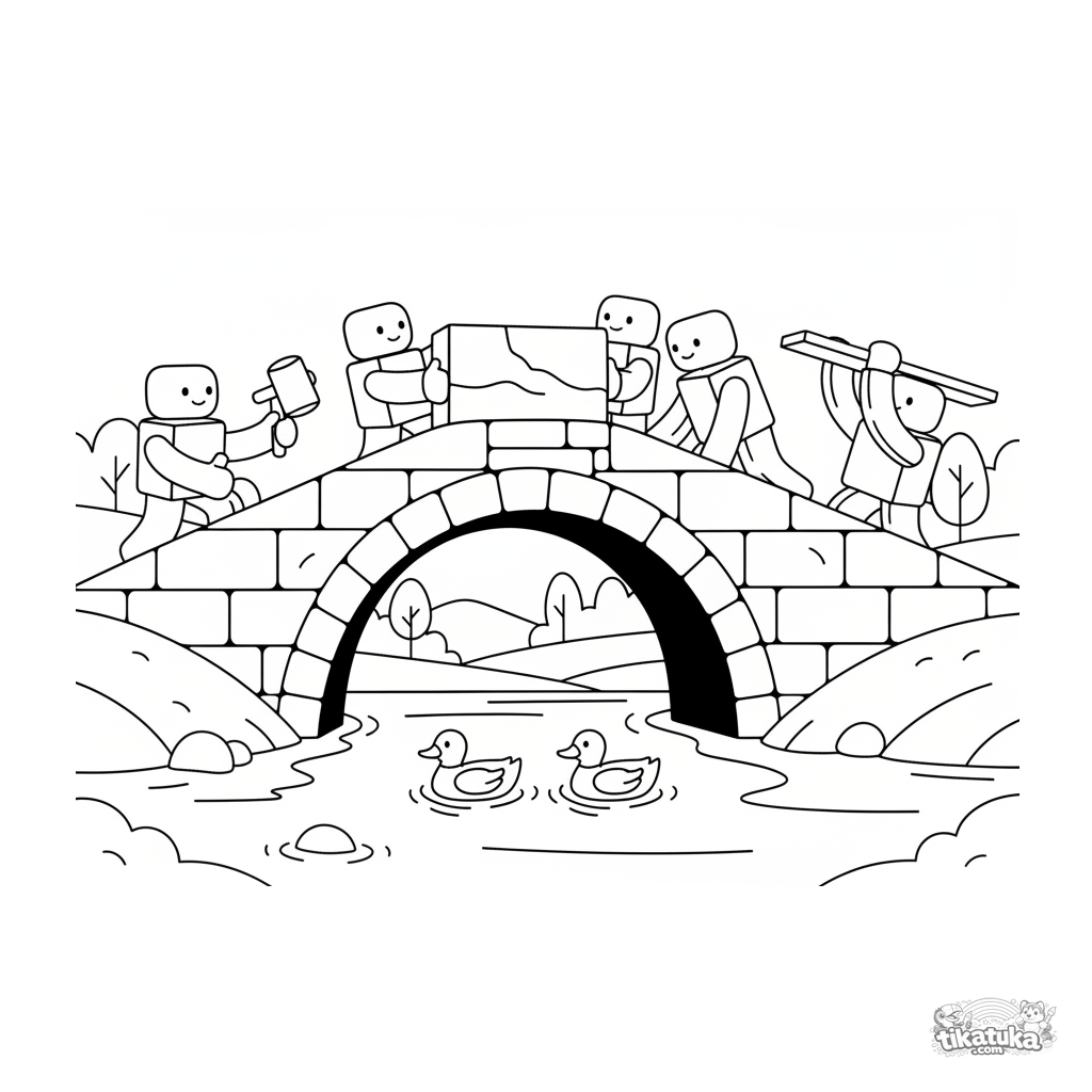 Página para colorear para niños de 4-6 años: constructores de juguete terminan un puente de piedra sobre un río. Formas geométricas simples y una escena divertida.