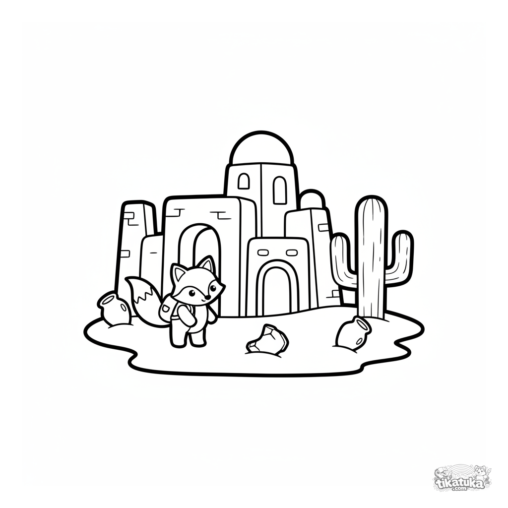 Página para colorear para niños pequeños 2-3: un palacio desértico simple y un zorro explorador. Formas grandes estilo juguete de madera, perfectas para primeros lápices.