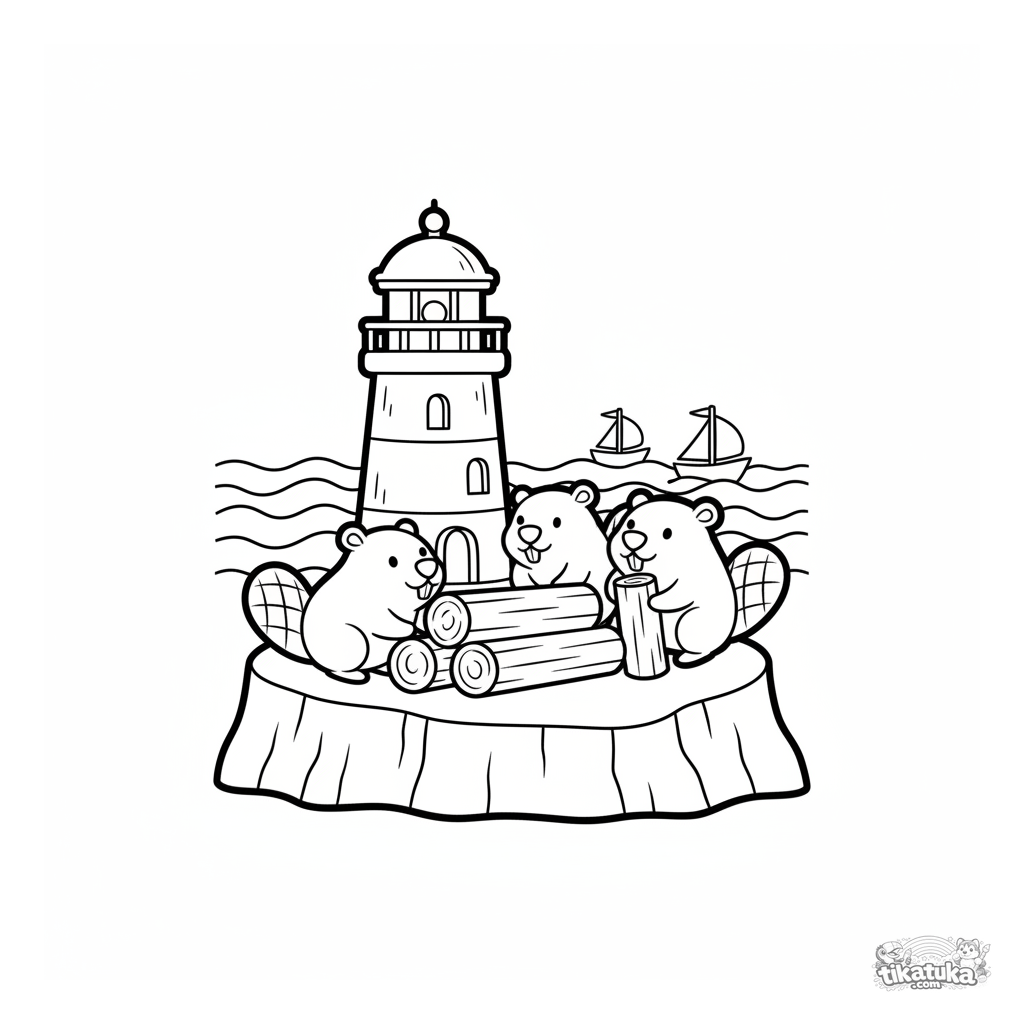 Página para colorear para niños pequeños 2-3: un faro simple en un acantilado, castores construyendo una presa en su base. Formas grandes como juguetes de madera, márgenes muy amplios.