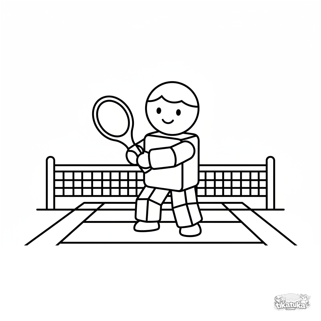 Página muy simple para colorear para bebés de 2-3 años: un juguete de madera de tenista en una pista con red. Formas geométricas grandes.
