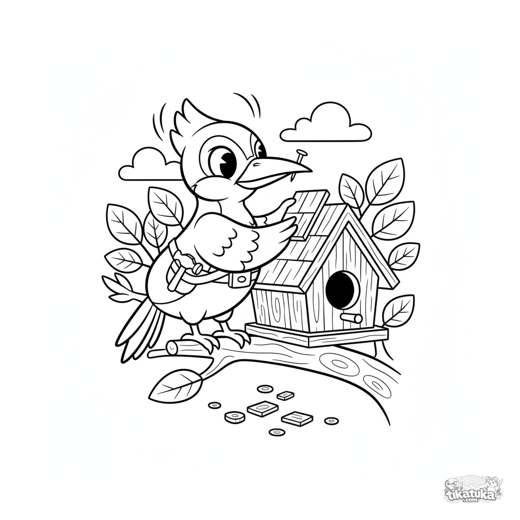 Página para colorear para 7-9 años: un pájaro carpintero arreglando el techo de una casa de pájaros. Escena divertida con herramientas y un clavo en el pico.