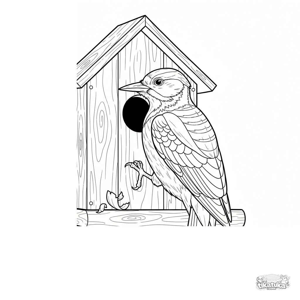 Página para colorear compleja para 10-12 años: un pájaro carpintero se aferra a la pared de una casa de pájaros de madera, inspeccionándola atentamente. Anatomía realista, textura de madera detallada.