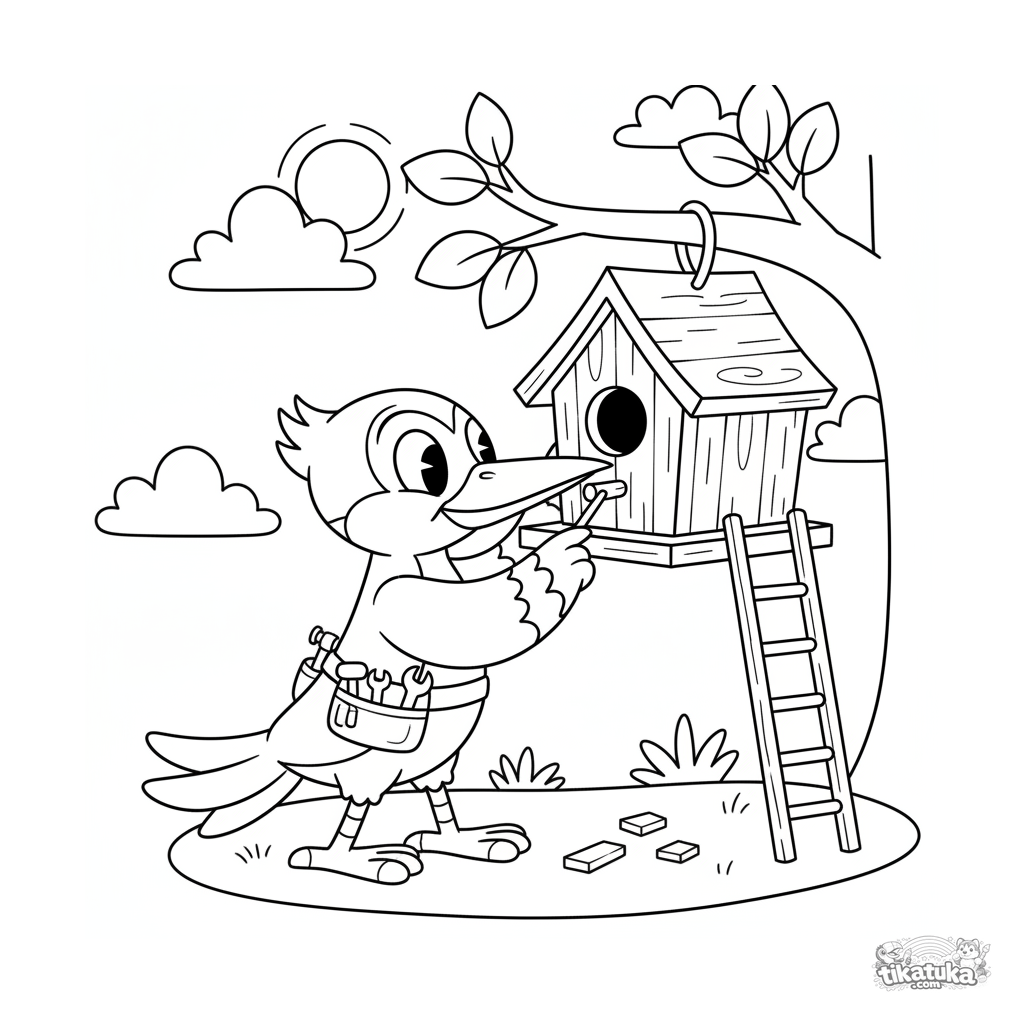 Página para colorear para niños 4-6: un alegre pájaro carpintero al estilo retro inspecciona una casa de pájaros de madera. Con cinturón de herramientas y escalera.