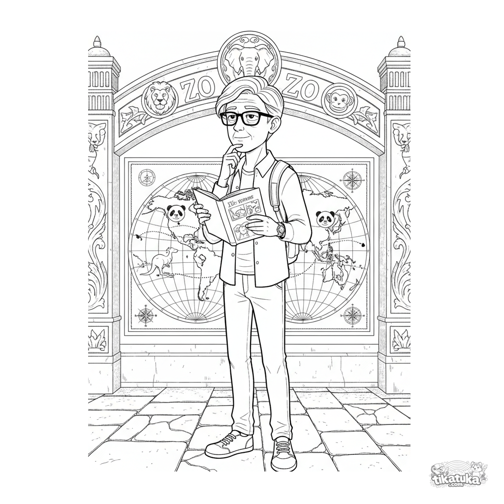Página para colorear para niños 10-12: un estudiante estudia un mapa mundial en la entrada del zoológico que muestra el origen de los animales. Escena educativa de geografía.