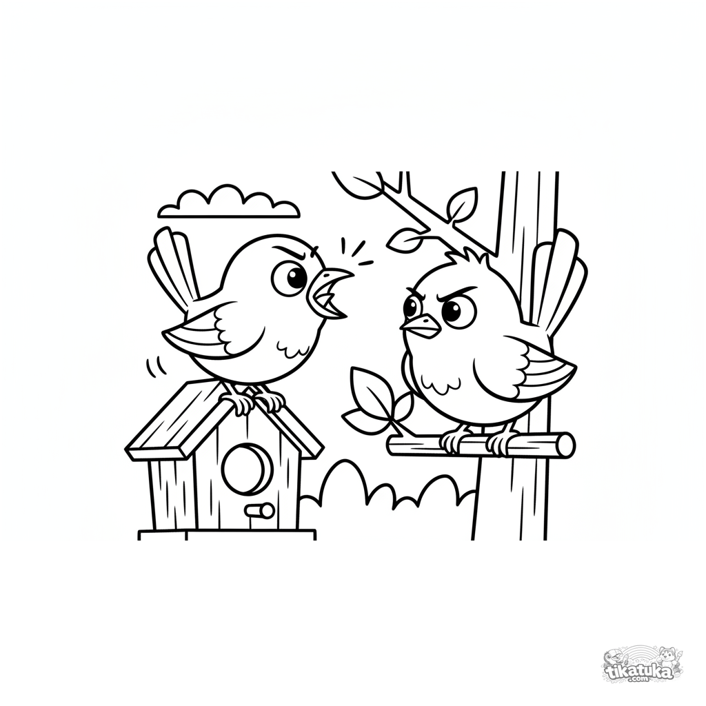 Página para colorear para niños 7-9: dos chochines divertidos están teniendo una discusión animada en la percha frente a la entrada de una casa de pájaros. Poses y emociones expresivas.