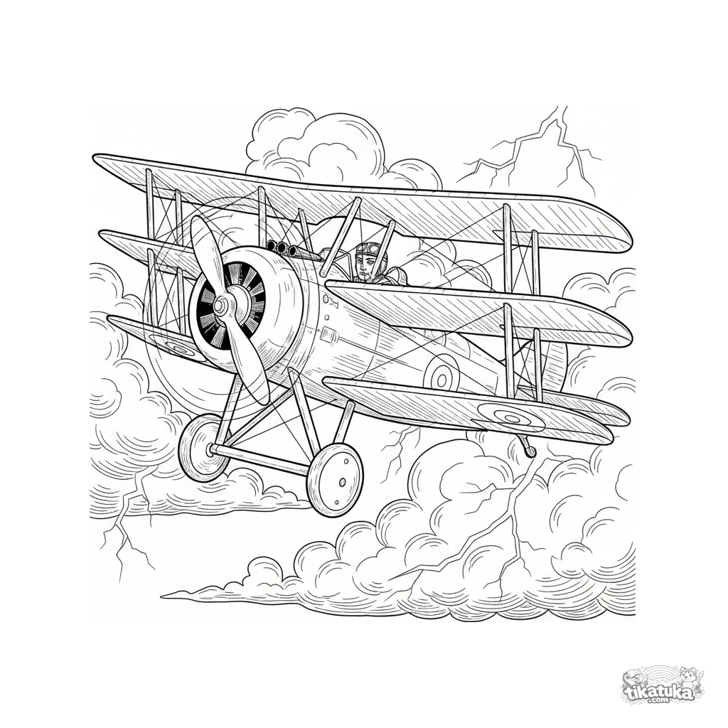 Página para colorear detallada de un triplano de la Primera Guerra Mundial haciendo un lazo en un cielo tormentoso. Para niños mayores de 10 a 12 años. Estilo de grabado vintage.