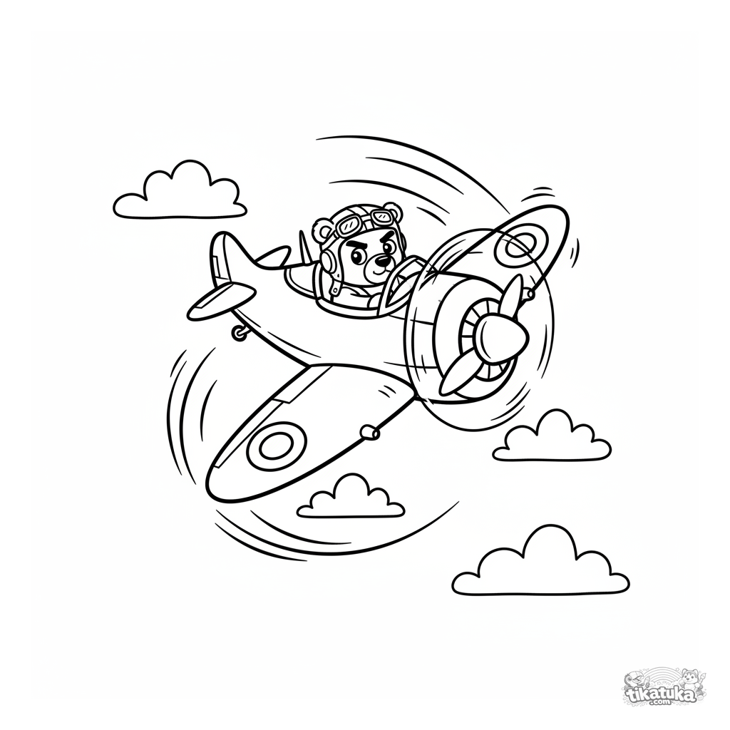 Página para colorear de un caza de la WWII haciendo un lazo. Para 4-6 años. Un piloto oso decidido en la cabina.