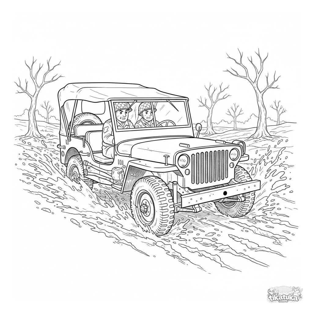 Página para colorear detallada de un jeep militar de la Segunda Guerra Mundial conduciendo por un campo fangoso. Para niños de 7 a 12 años. Presenta salpicaduras de barro, una rueda de repuesto y un conductor soldado.