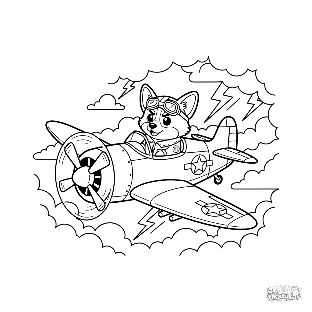 Página para colorear de un caza de la WWII pilotado por un valiente corgi, virando bruscamente en un cielo tormentoso. Para niños de 7 a 9 años.