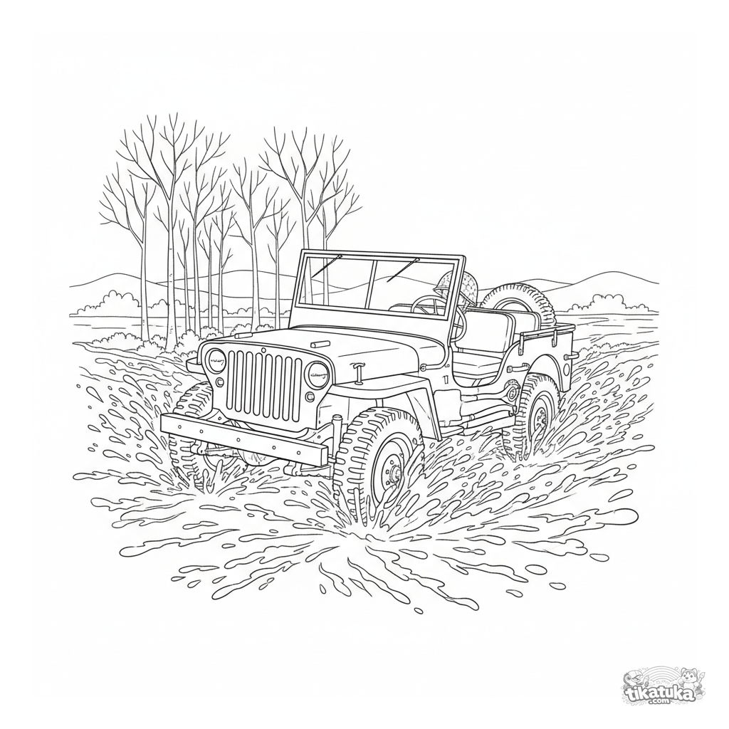 Página detallada para colorear de un jeep de la Segunda Guerra Mundial para niños de 7 a 12 años.