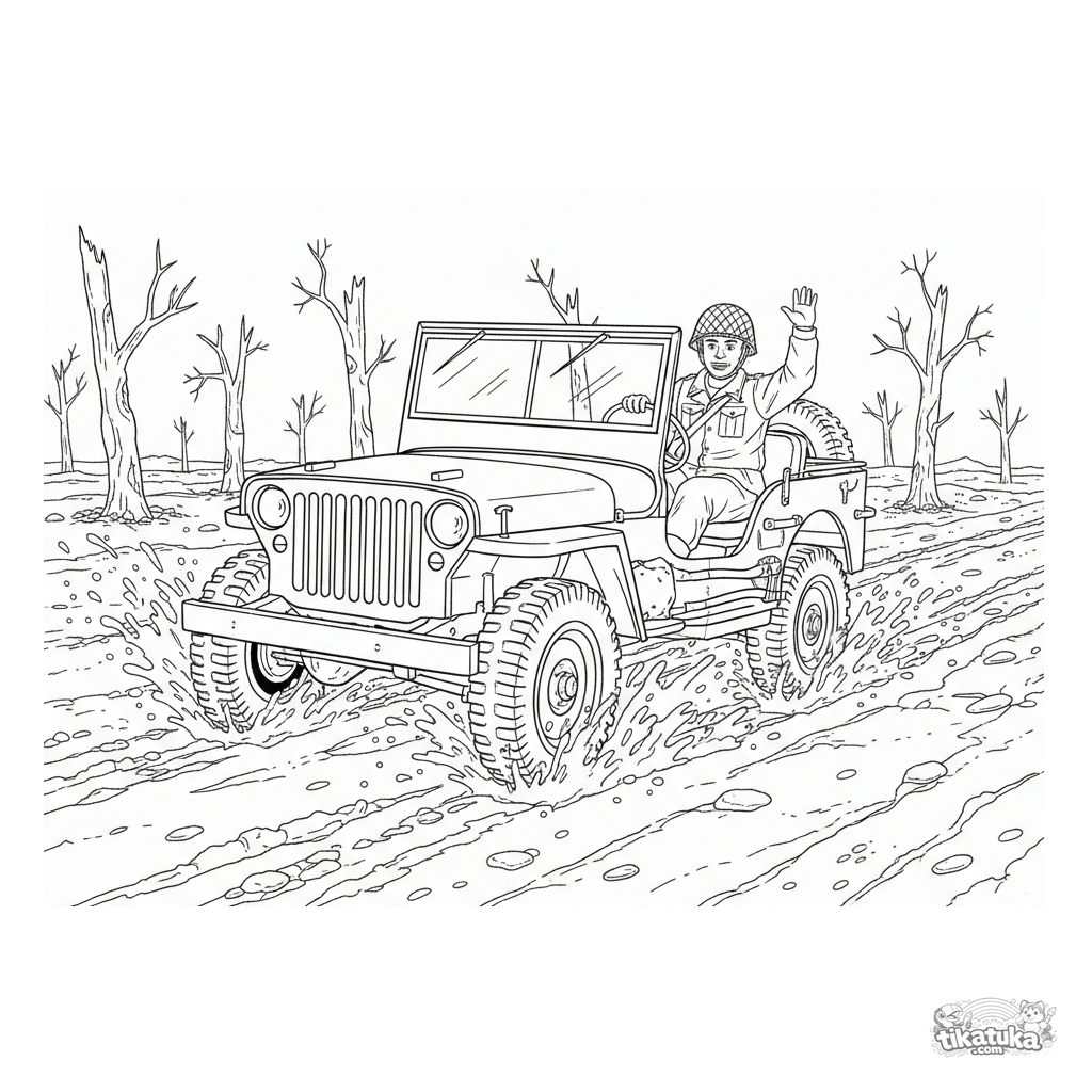 Página para colorear detallada para niños de 7 a 12 años con un jeep de la Segunda Guerra Mundial. El jeep avanza por un campo fangoso, un soldado saluda desde el asiento del pasajero.