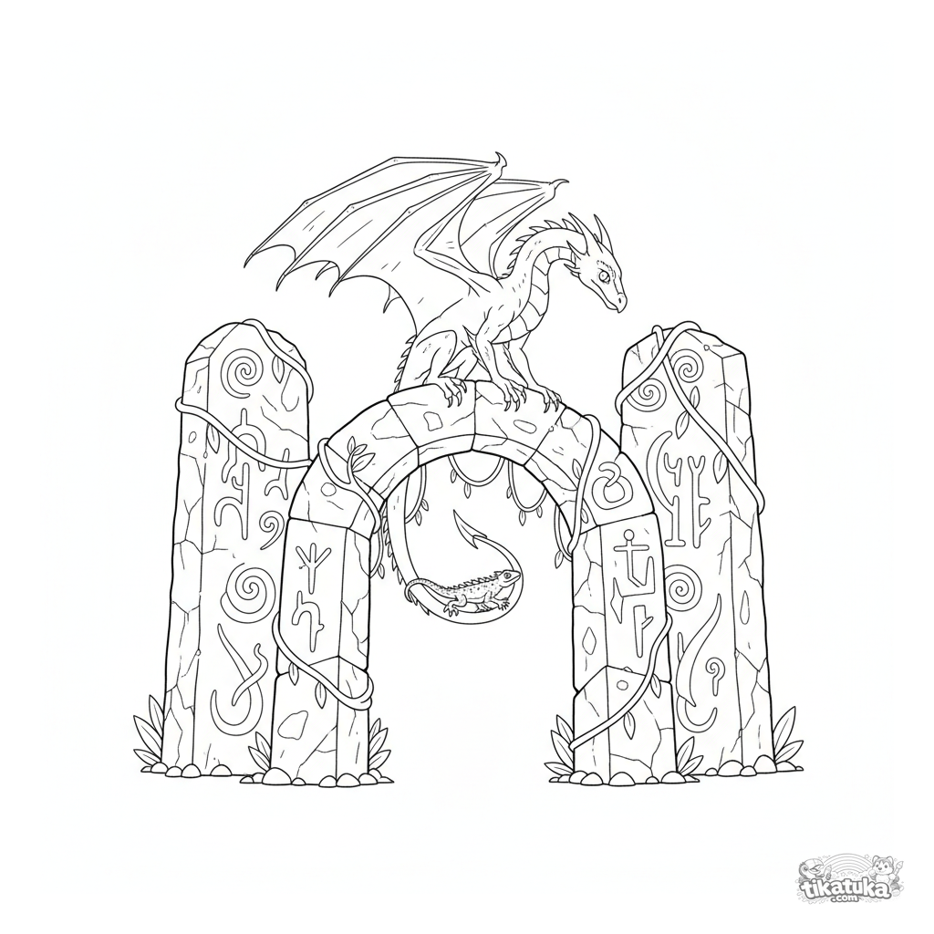 Página para colorear para preadolescentes 7-9: una ágil viverna posada en un antiguo arco rúnico entre monolitos, observando una lagartija. Detalle moderado en arquitectura y criatura.