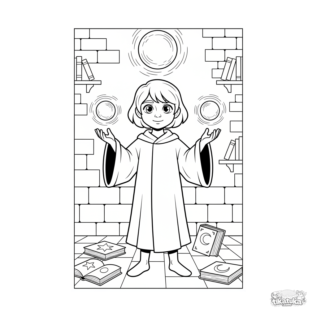 Página para colorear para niños 4-6: un joven aprendiz de mago en una torre se concentra en practicar, equilibrando tres esferas mágicas brillantes.