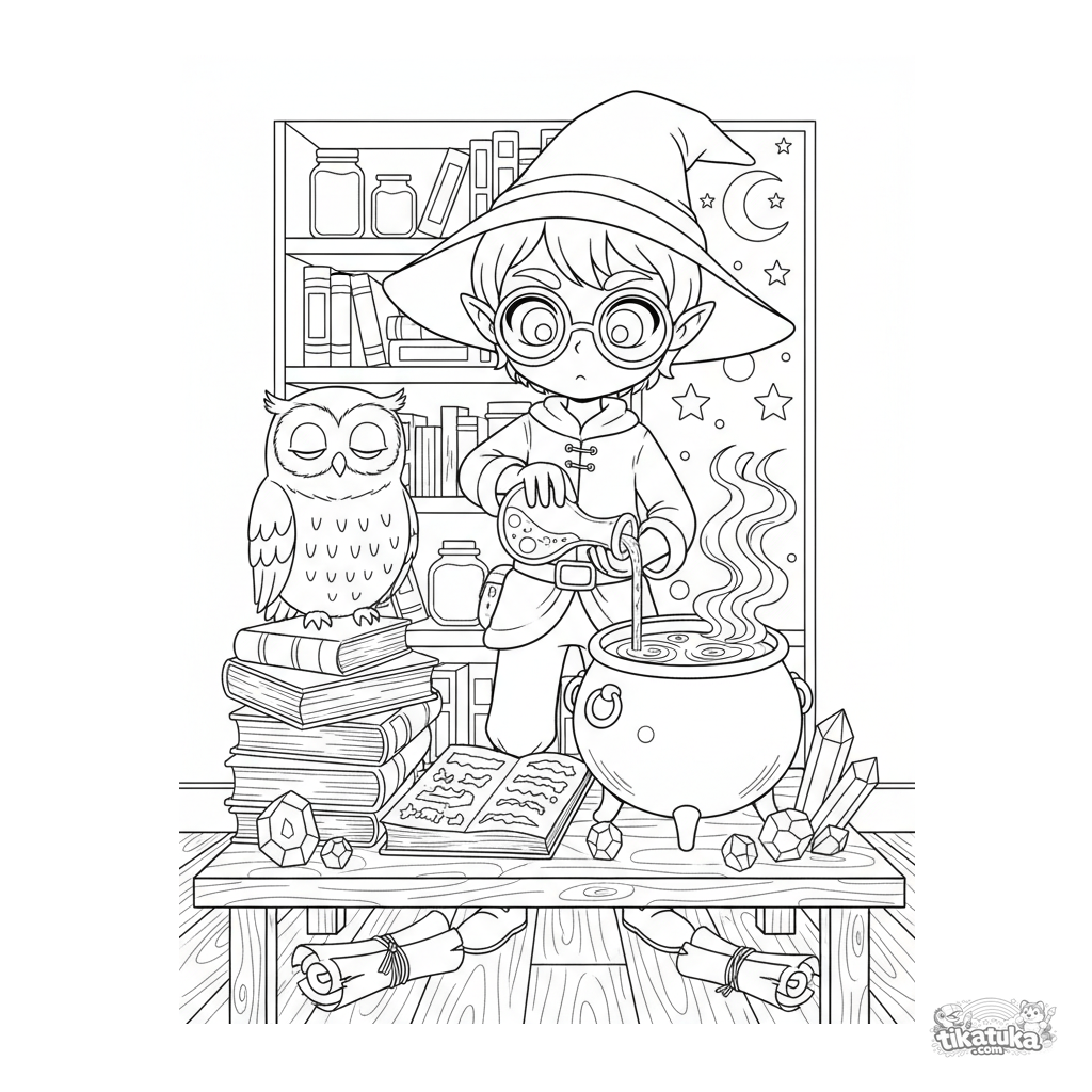 Página para colorear para niños mayores de 10-12 años: un aprendiz elfo preparando una poción brillante en un taller de torre desordenado. Escena detallada con libros y un búho.