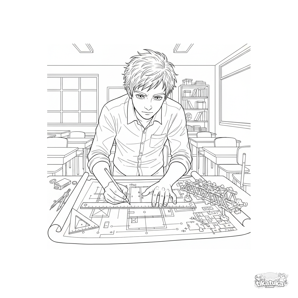 Página para colorear detallada para niños 10-12: un joven arquitecto trabaja en un plano en un pupitre. Estilo de plano técnico, muchas líneas.