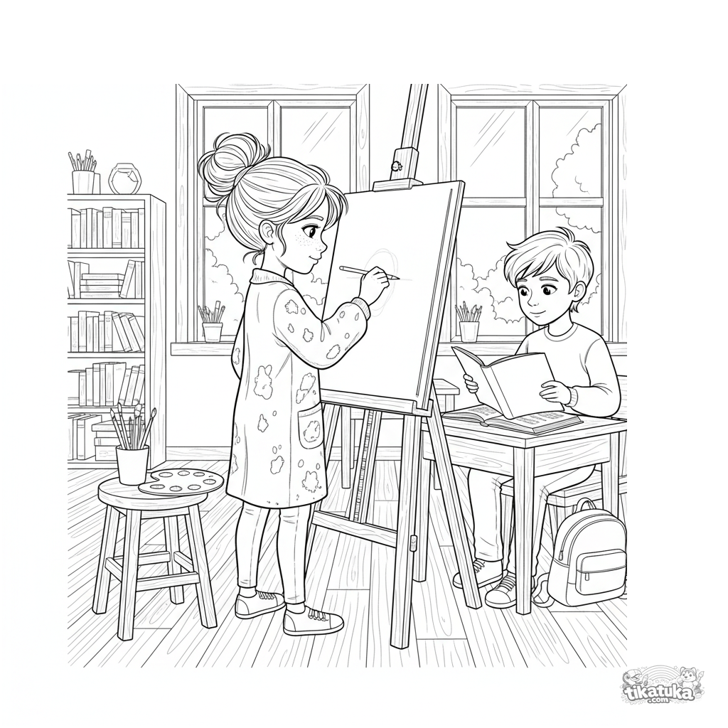 Página para colorear para niños mayores 10-12: una joven artista en un aula dibuja el retrato de un compañero en un caballete. Escena detallada, suministros de arte.