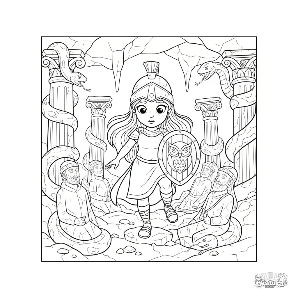Página para colorear para niños de 7-9 años: una joven guerrera en la guarida de Medusa Gorgona. Escena con estatuas de piedra y columnas, llena de atmósfera misteriosa de mito antiguo.