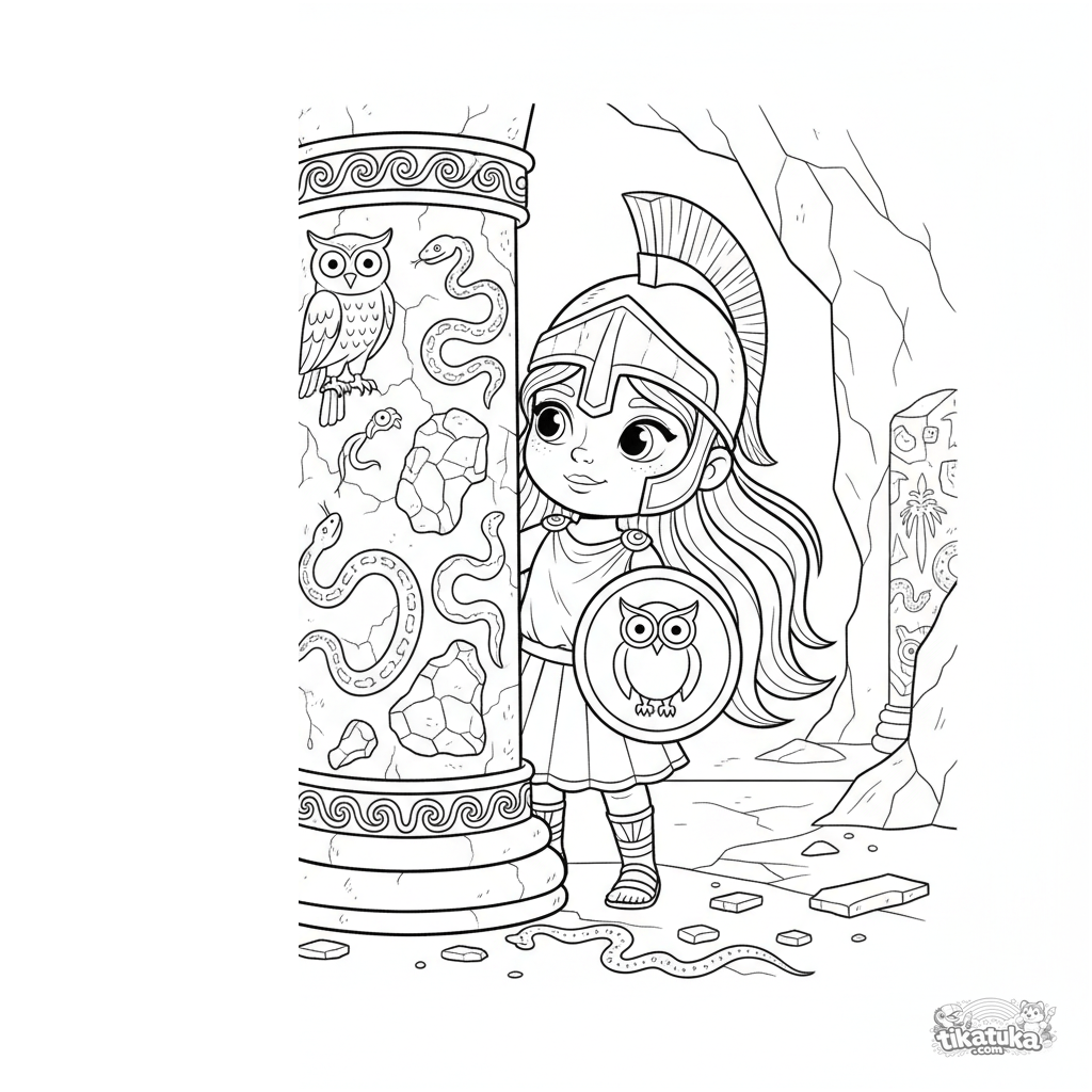 Página para colorear: una joven guerrera inspirada en Atenea asoma tras un pilar de piedra en la guarida de la Gorgona. Para 7-9 años, cuerpo completo visible.