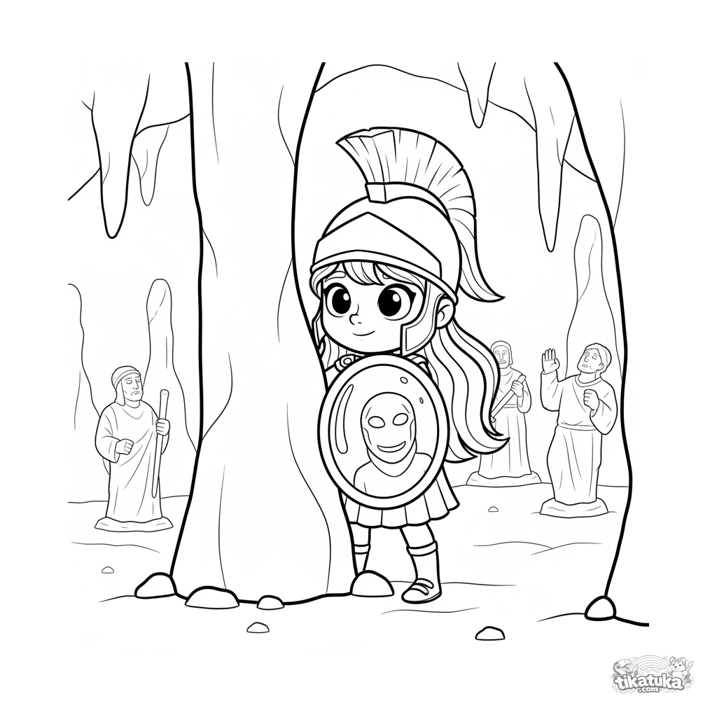 Página para colorear para niños de 7-9 años: una joven guerrera en la guarida de la Gorgona. Representada con un escudo entre estatuas de piedra.