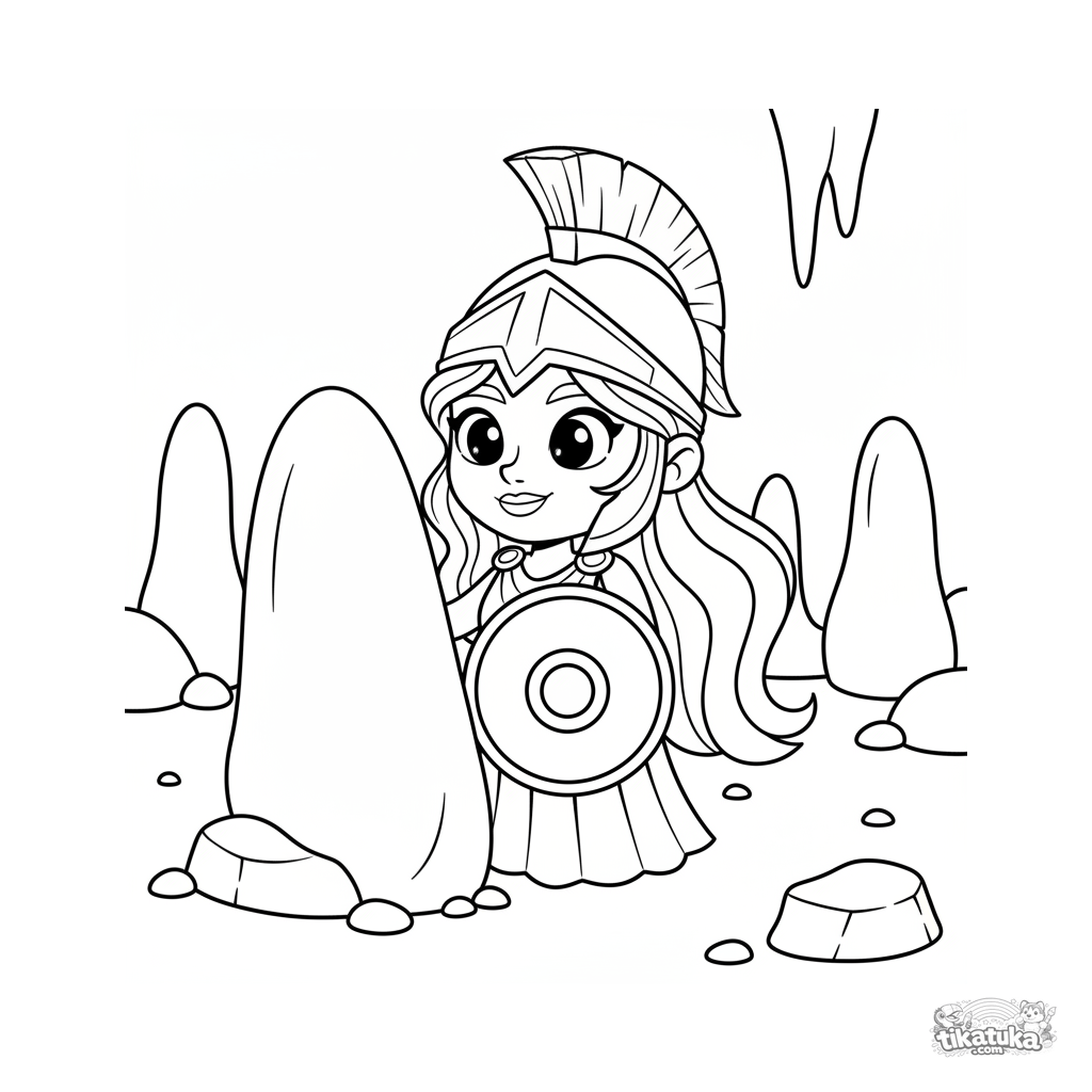 Página para colorear para niños 7-9: joven guerrera Atenea en la guarida de la Gorgona. Escena con escudo y estalagmitas, llena de misterio y preparación.