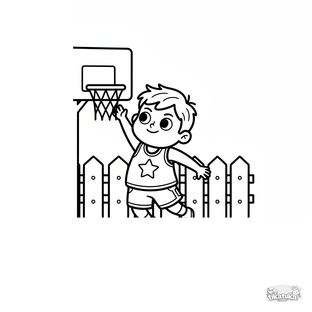 Página para colorear simple para pequeños de 2-3 años: un niño salta para encestar en una cancha exterior. Formas grandes, pocos detalles.