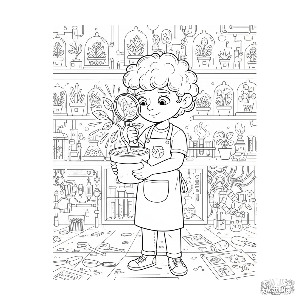 Página detallada para colorear para niños de 10-12 años: un joven botánico estudia una planta bioluminiscente.