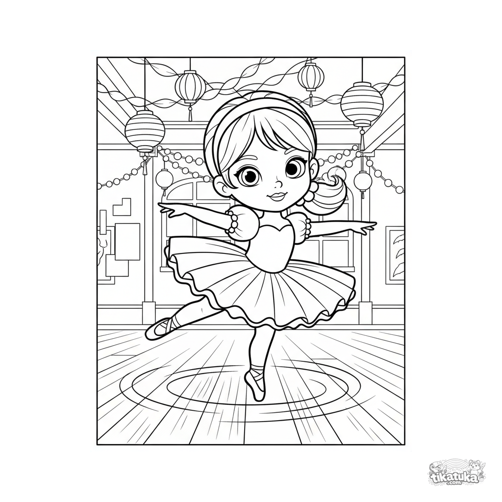 Página para colorear para niños de 7-9 años: una joven bailarina en tutú esponjoso practica un giro en un salón festivo decorado con guirnaldas.